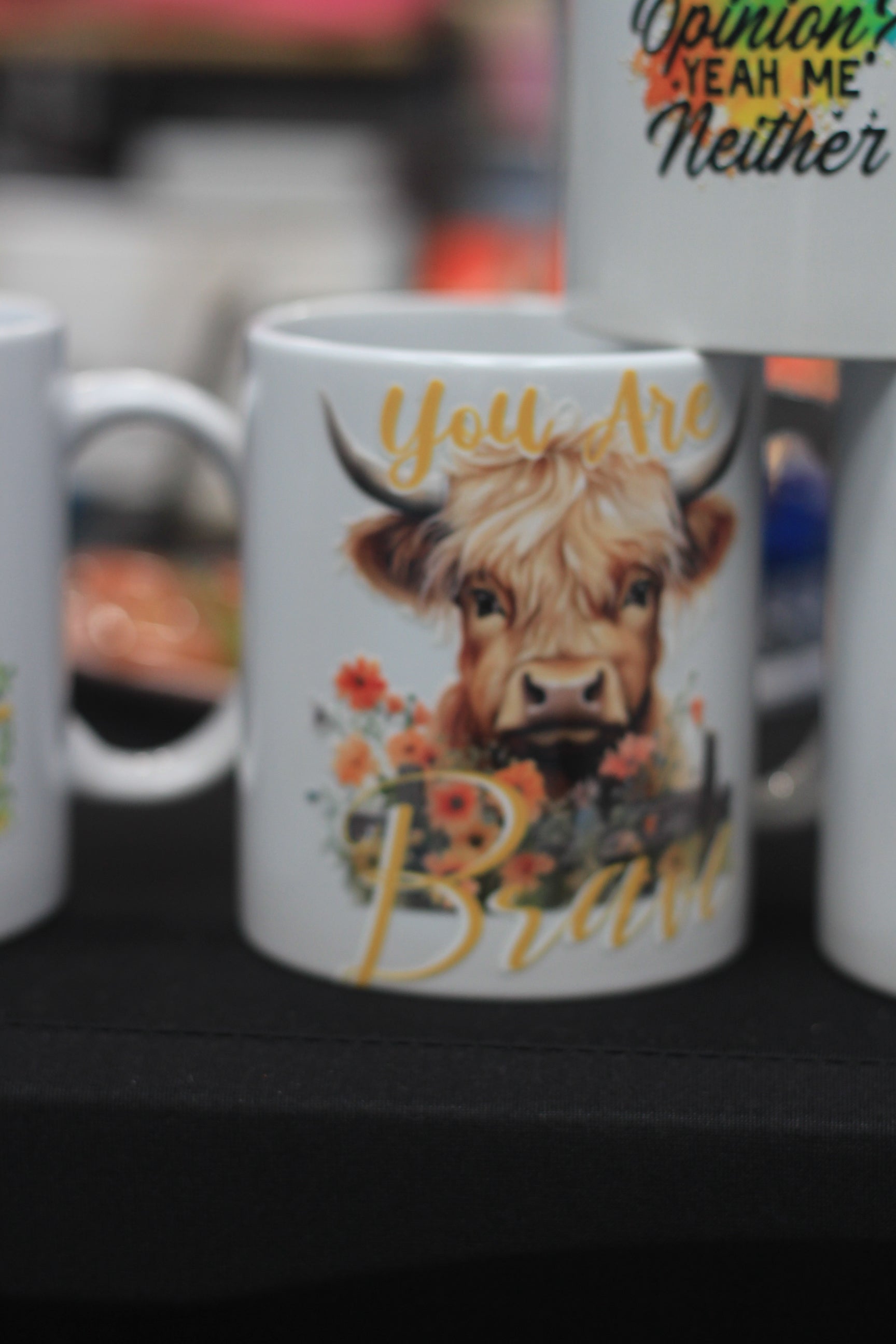 A mug with a highland cow transfer with You are Brave as text. The capacity is around 11fl oz and comes complete with a white gift box.