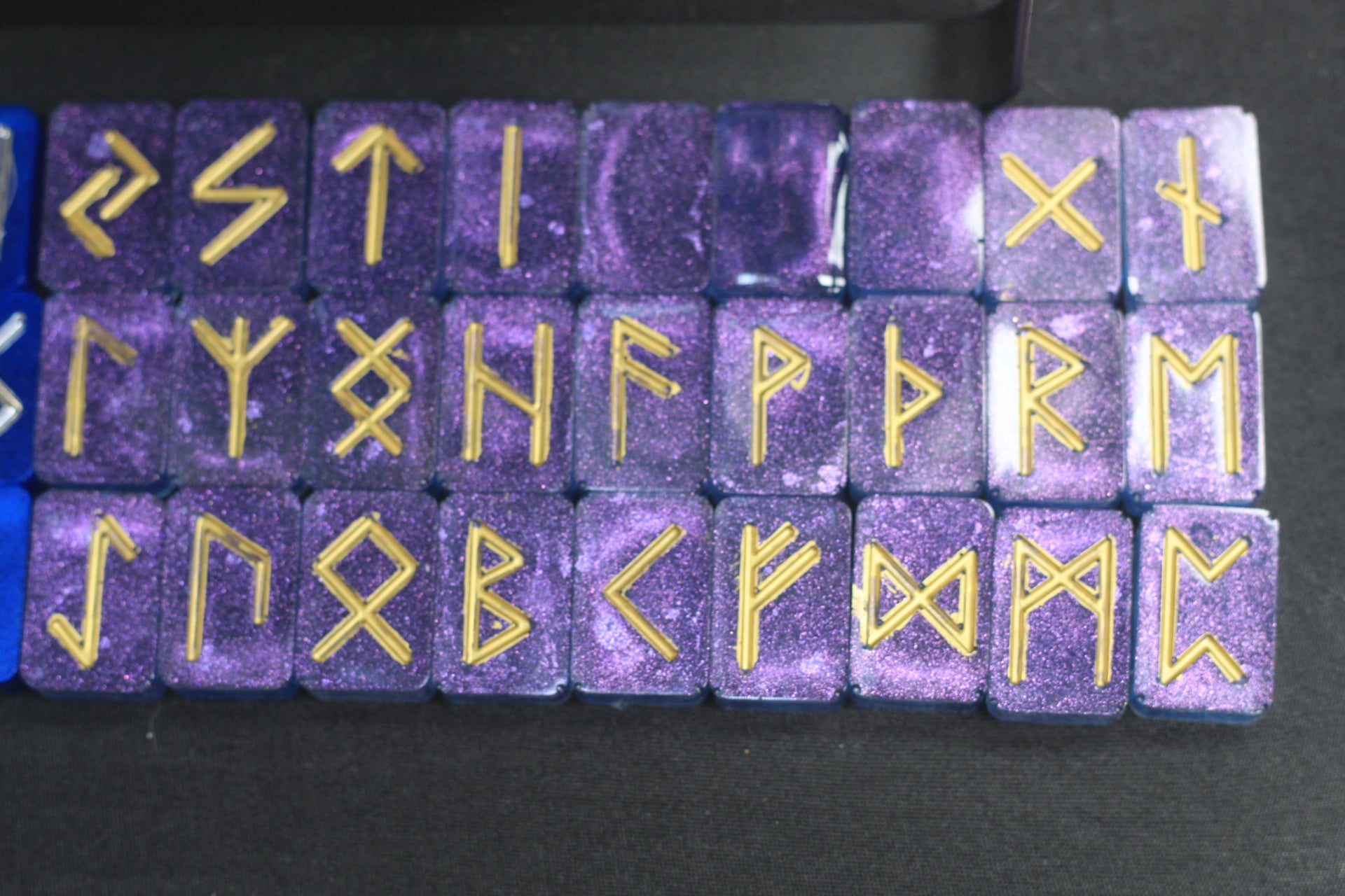 A set of runes in plain blue or purple. Contains 25 along with 3 blank faced runes